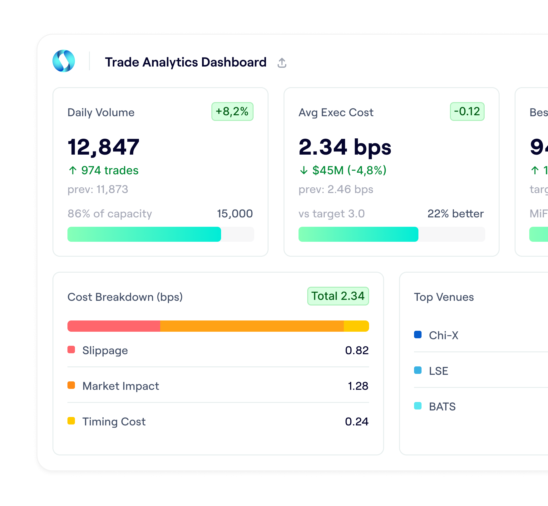 Go beyond T+1 static TCA reports. Analyze execution quality in real time across any dimension—trader, desk, venue, strategy, or time period. Calculate slippage, market impact, timing cost, and opportunity cost with instant drill-down to individual trades. Demonstrate MiFID II best execution compliance with full transparency and audit trails.